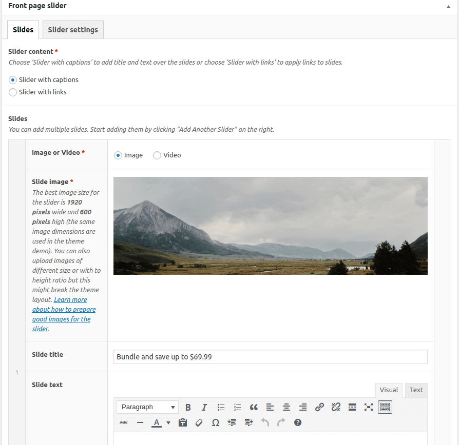 • Recommended dimensions for slider images are 1920 x 600 px, but it will also accept images of different ratio and adapt accordingly.